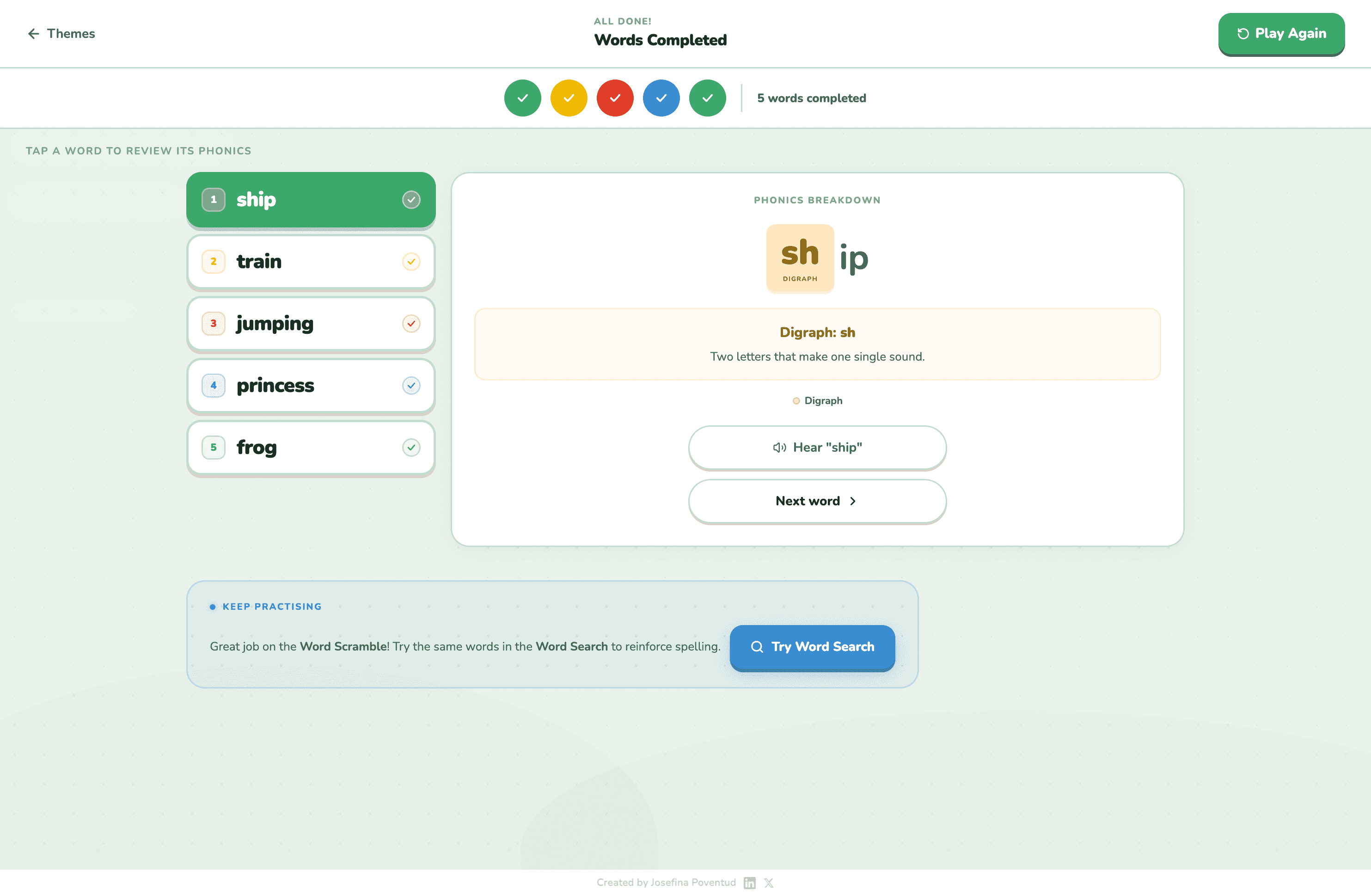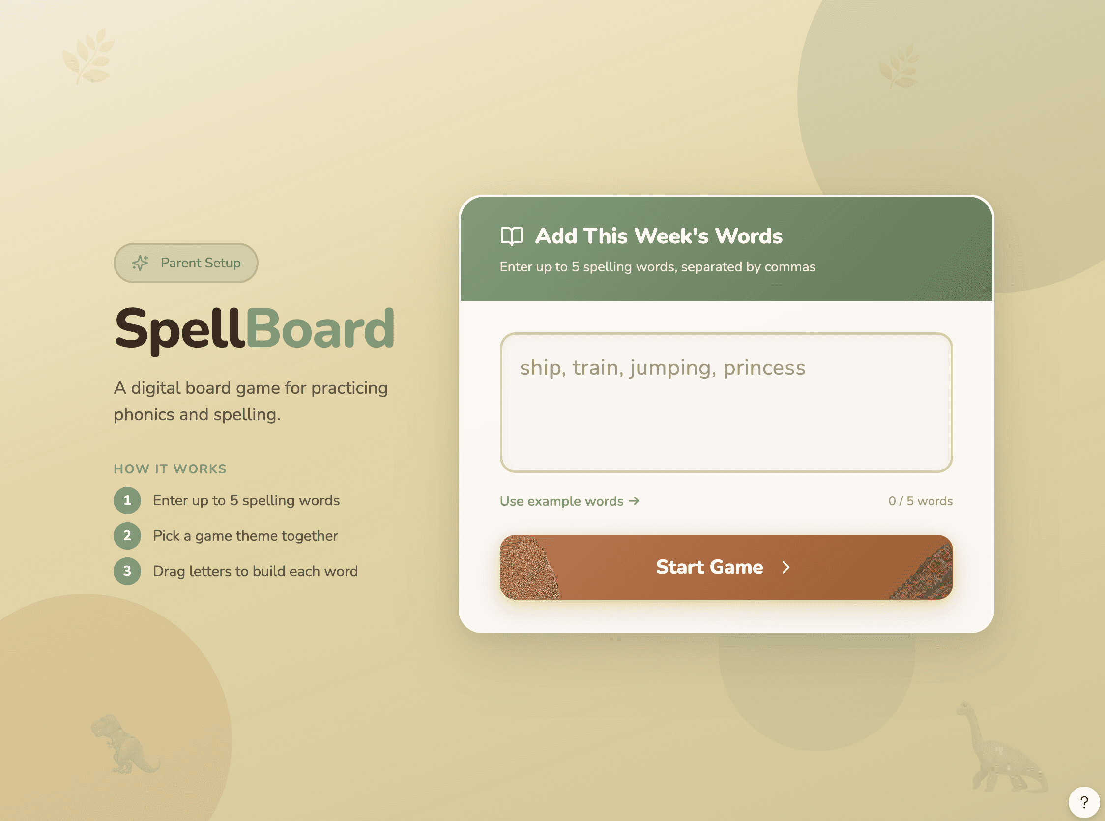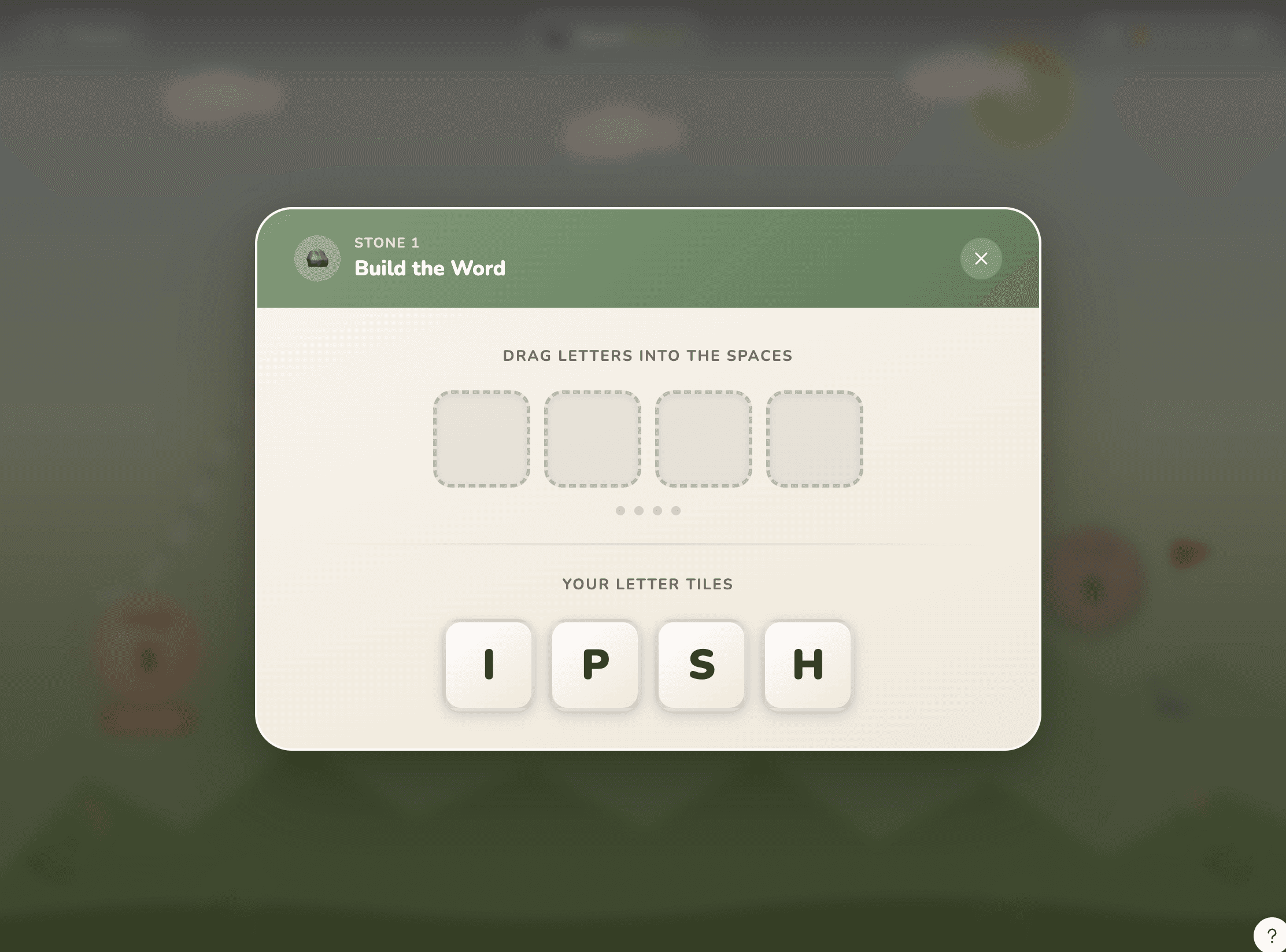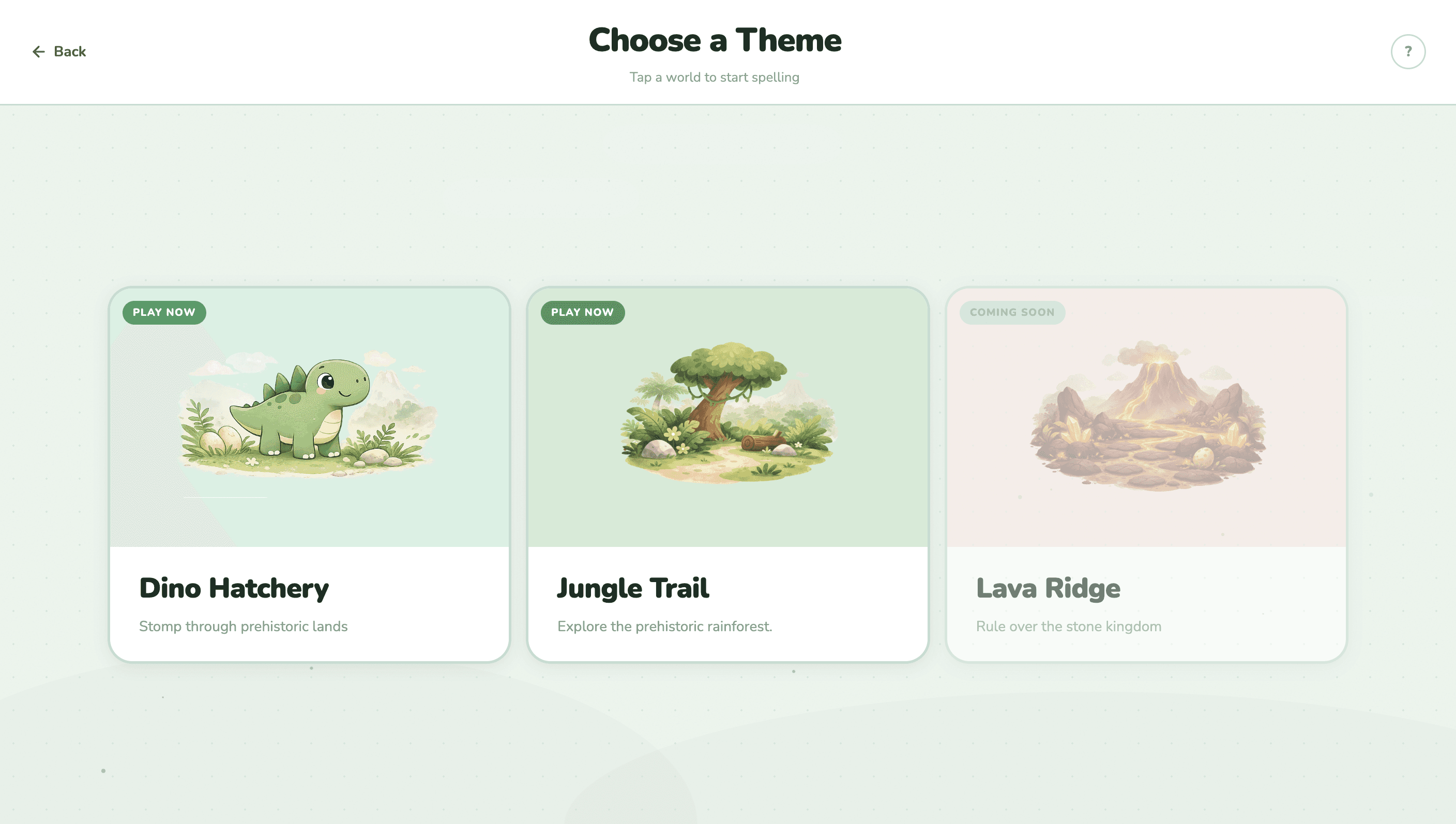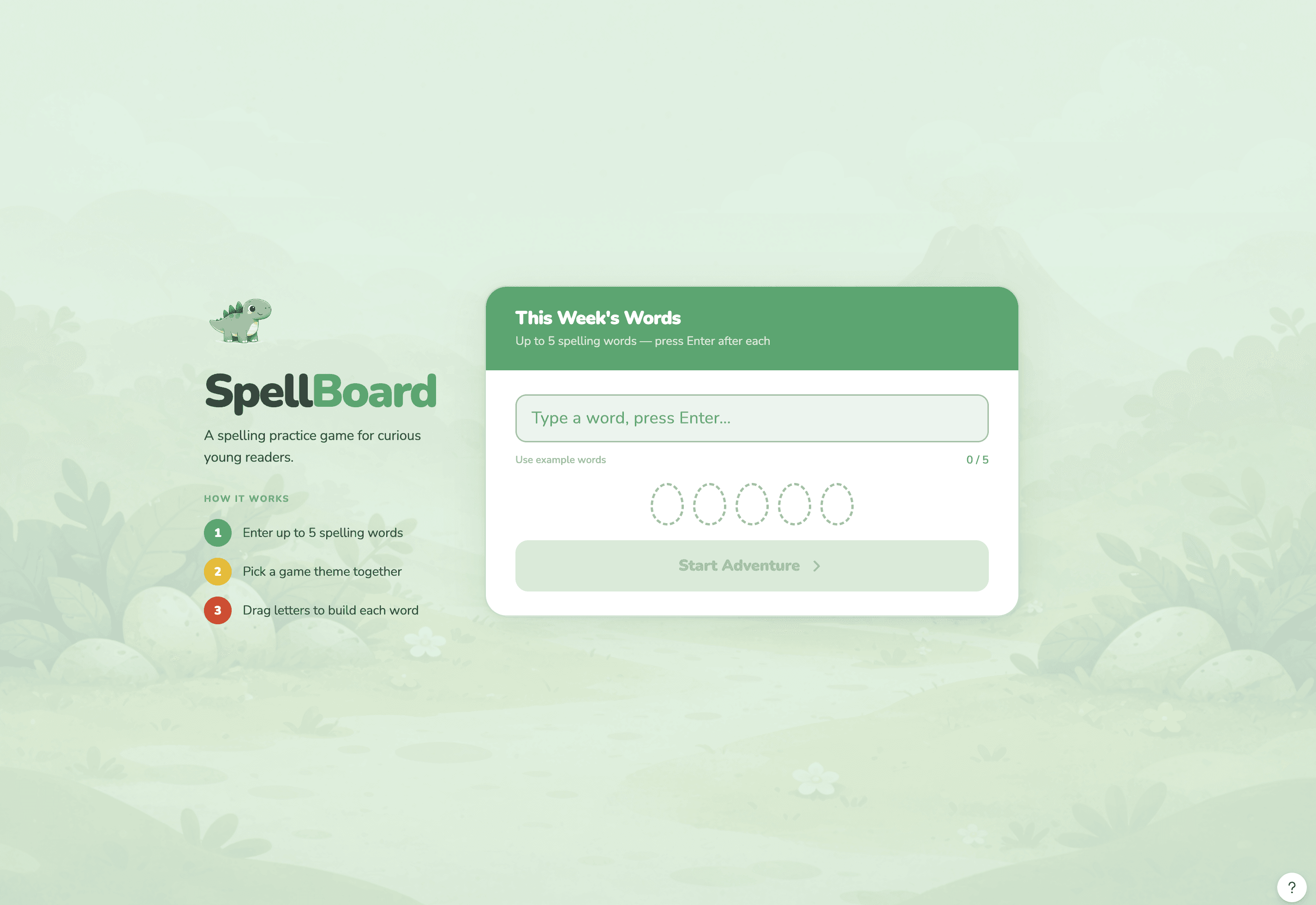 I wanted to explore what spelling practice could feel like if it were interactive, playful, and inviting instead of repetitive. Parents enter spelling words, children choose a themed world, and letters become part of a small adventure where they drag and place tiles to build each word.